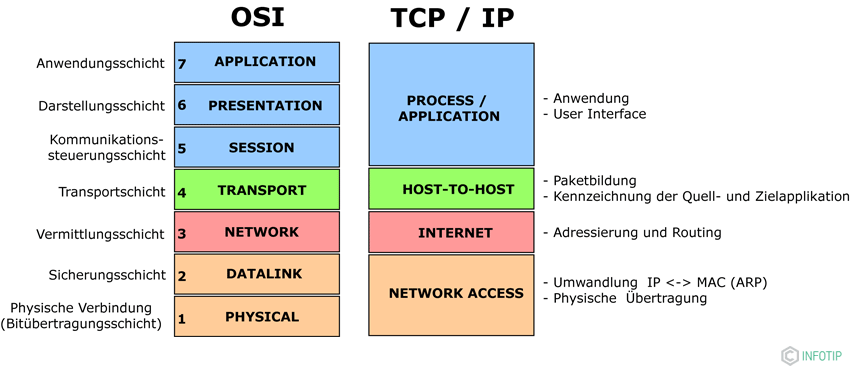 Vergleich OSI/ISO Schichtenmodell mit TCP/IP-Schichtenmodell