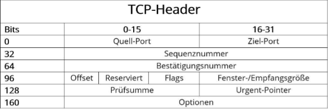 - Prüfsumme (16 Bit): Das Transmission Control Protocol kann Übertragungsfehler zuverlässig erkennen. Hierfür wird die Prüfsumme herangezogen, die aus dem Header, den Nutzdaten und dem sogenannten Pseudo-Header berechnet wird.