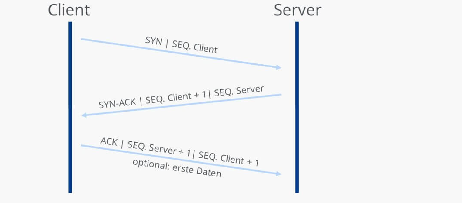 - Zuerst schickt der Client an den Server einen Verbindungswunsch (SYN).