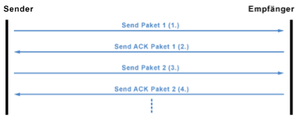 - Der Empfänger nimmt das Paket entgegen (Receive Paket 1) und bestätigt den Empfang (Send ACK Paket 1).